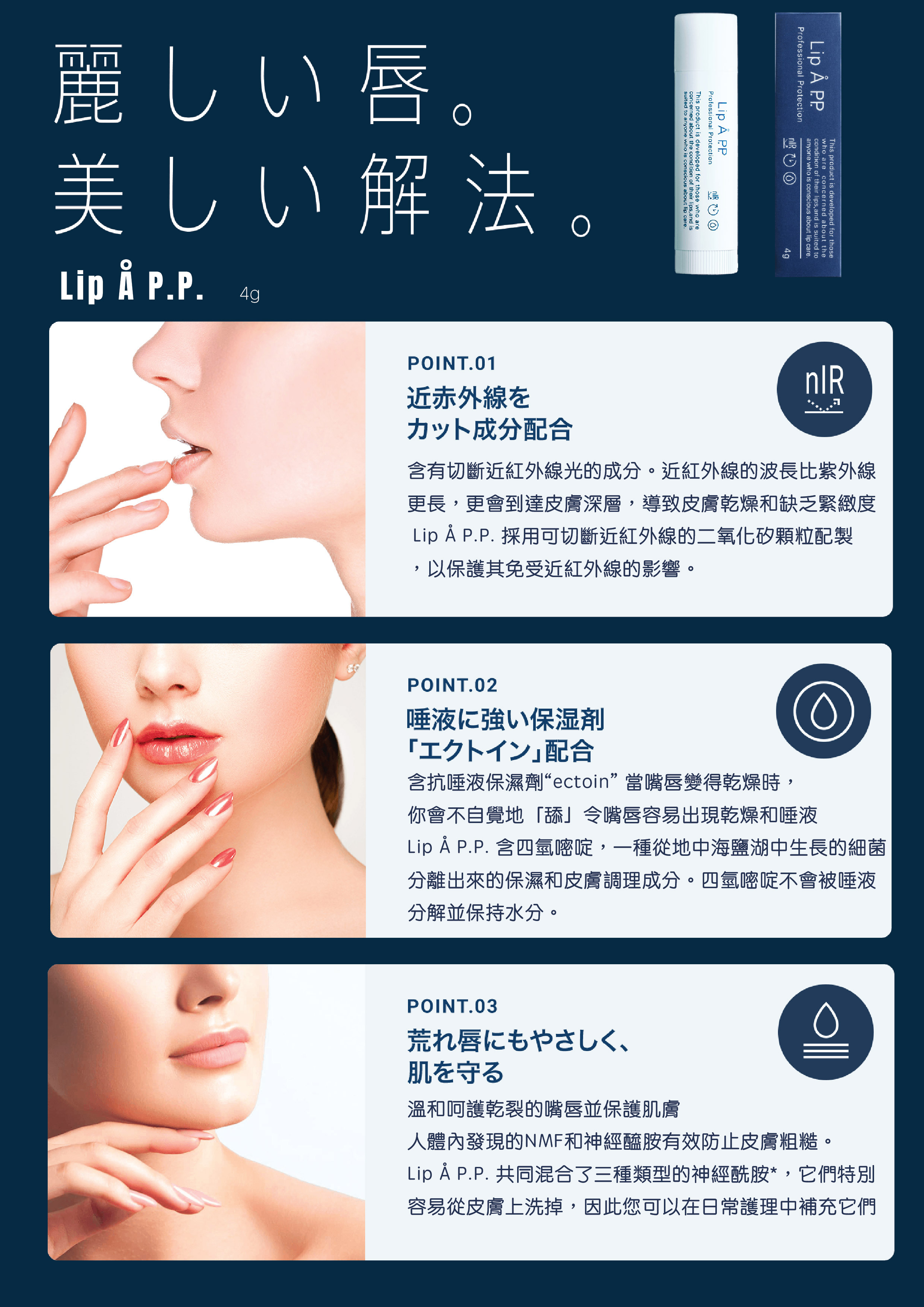 嘴唇乾裂也取決於生活習慣,據說在青少年和 20 多歲的人中更常見,他們關心自己的嘴唇並有刺激嘴唇的習慣。 特別是,舔嘴唇是不允許的。 另一方面,無意識舔嘴唇的行為每天都會發生,即使塗了潤唇膏,容易被唾液分解的成分也不再具有預期的保濕效果。 因此,Lip A P.P.重點研究了不會被唾液分解的保濕劑“四氫嘧啶”。 「Ectoin」不僅能抵抗唾液,還具有類似「尿囊素」的保濕效果,是常見的保濕劑。